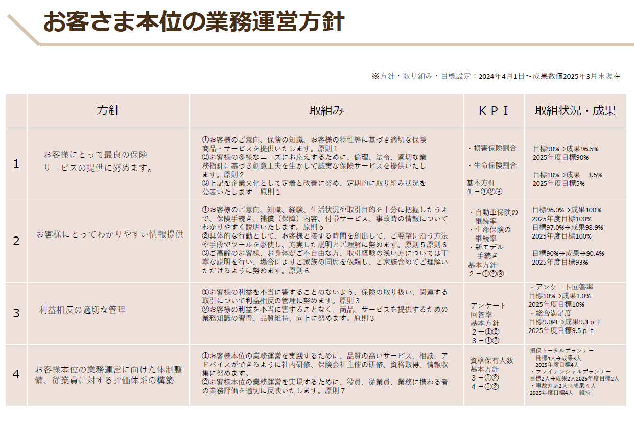 - ②お客様の多様なニーズにお応えするため、倫理、法令、適切な業務指針に基づき、創意工夫を活かして誠実な保険サービスを提供致します。(原則2)