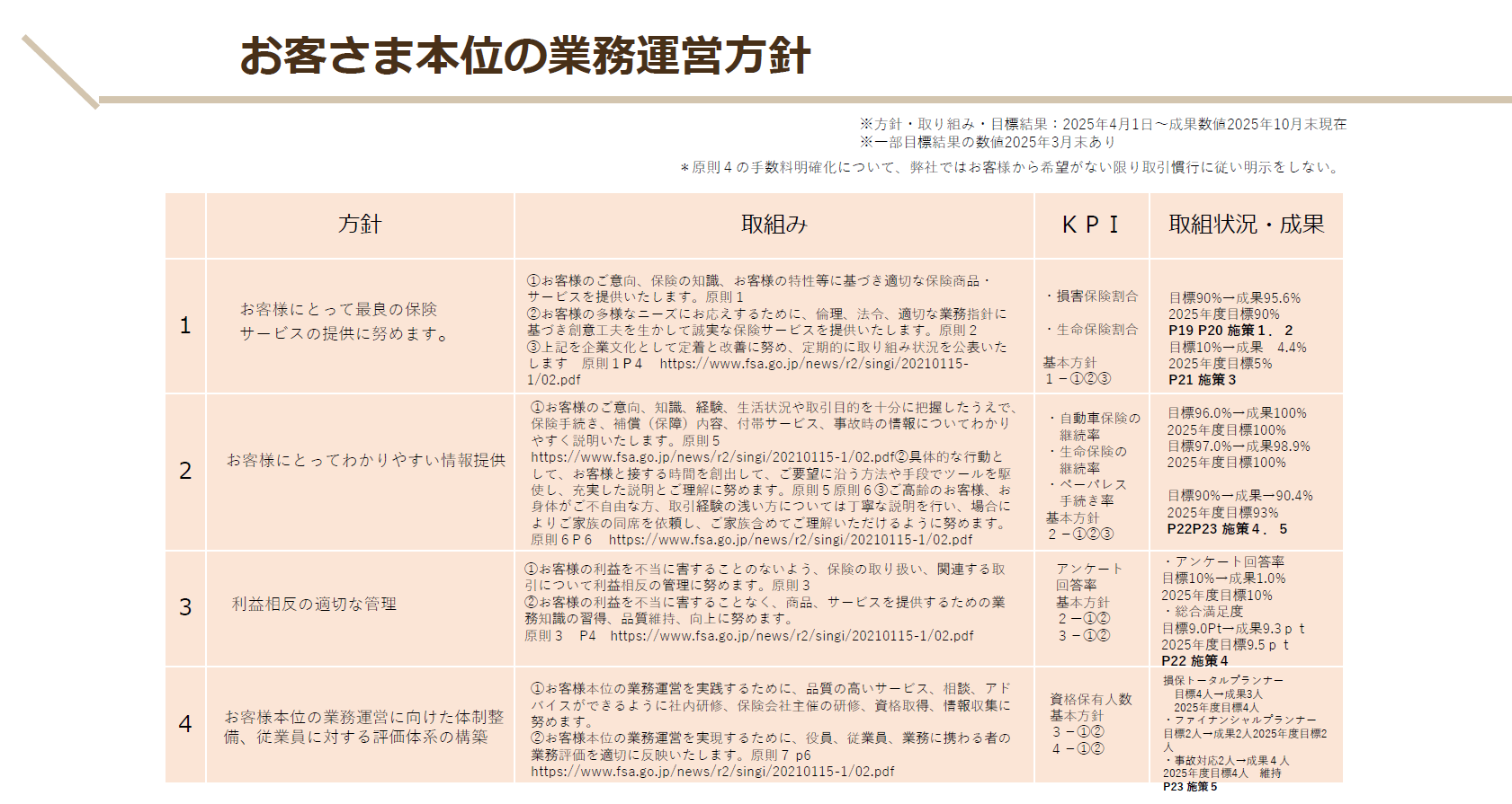 • ②お客様の多様なニーズにお応えするため、倫理、法令、適切な業務指針に基づき、創意工夫を活かして誠実な保険サービスを提供致します。(原則2)